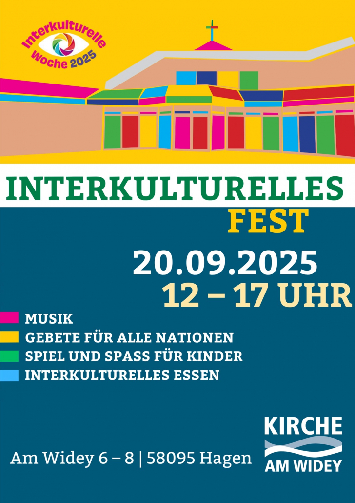 Herzliche Einladung zum interkulturellen Fest in Hagen. Unsere Gemeinde nimmt im Zuge der 50 interkulturellen Woche der Stadt Hagen am 20.09. in der Zeit von 12 bis 17 Uhr mit einem eigenen Programm in der Kirche am Widey teil. Jeder ist herzlich eingeladen. Der Eintritt ist kostenlos und eine Anmeldung ist nicht notwendig. Wir freuen uns auf Deinen Besuch. Auch für das leibliche Wohl ist gesorgt.